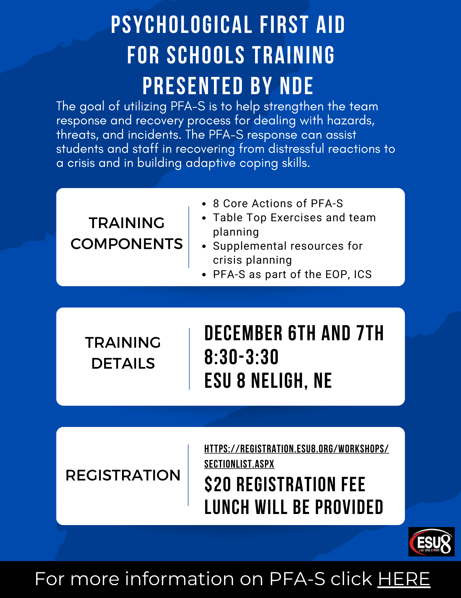 | Description | | More information about Psychological First Aid Training can be found by clicking this link https://www.education.ne.gov/safety/psychological-first-aid-training/