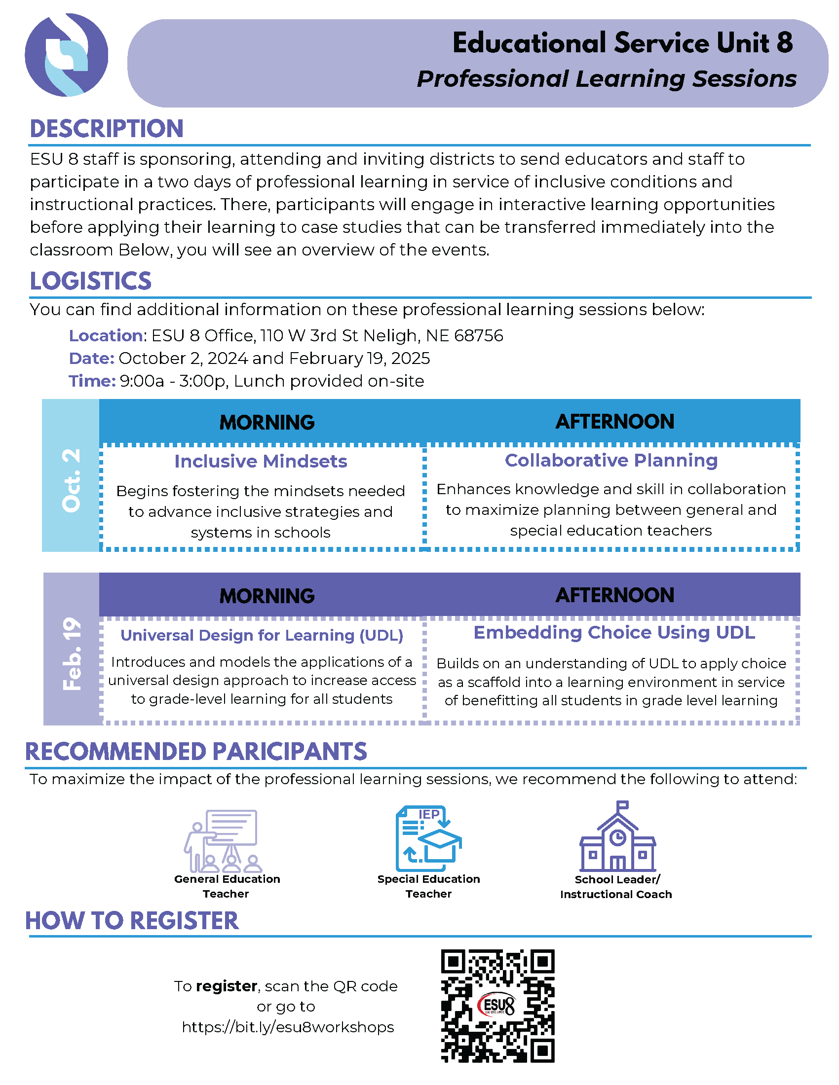 ESU 8 is excited to be inviting educators and staff to participate in a two days of professional learning in service of inclusive conditions and instructional practices. There, participants will engage in interactive learning opportunities before applying their learning to case studies that can be transferred immediately into the classroom.