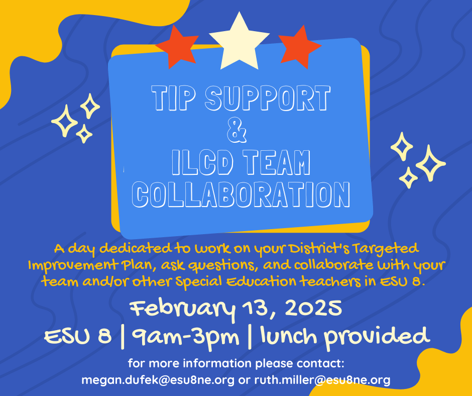 A day dedicated to work on your District's Targeted Improvement Plan, ask questions, and collaborate with your team and/or other Special Education teachers in ESU 8.