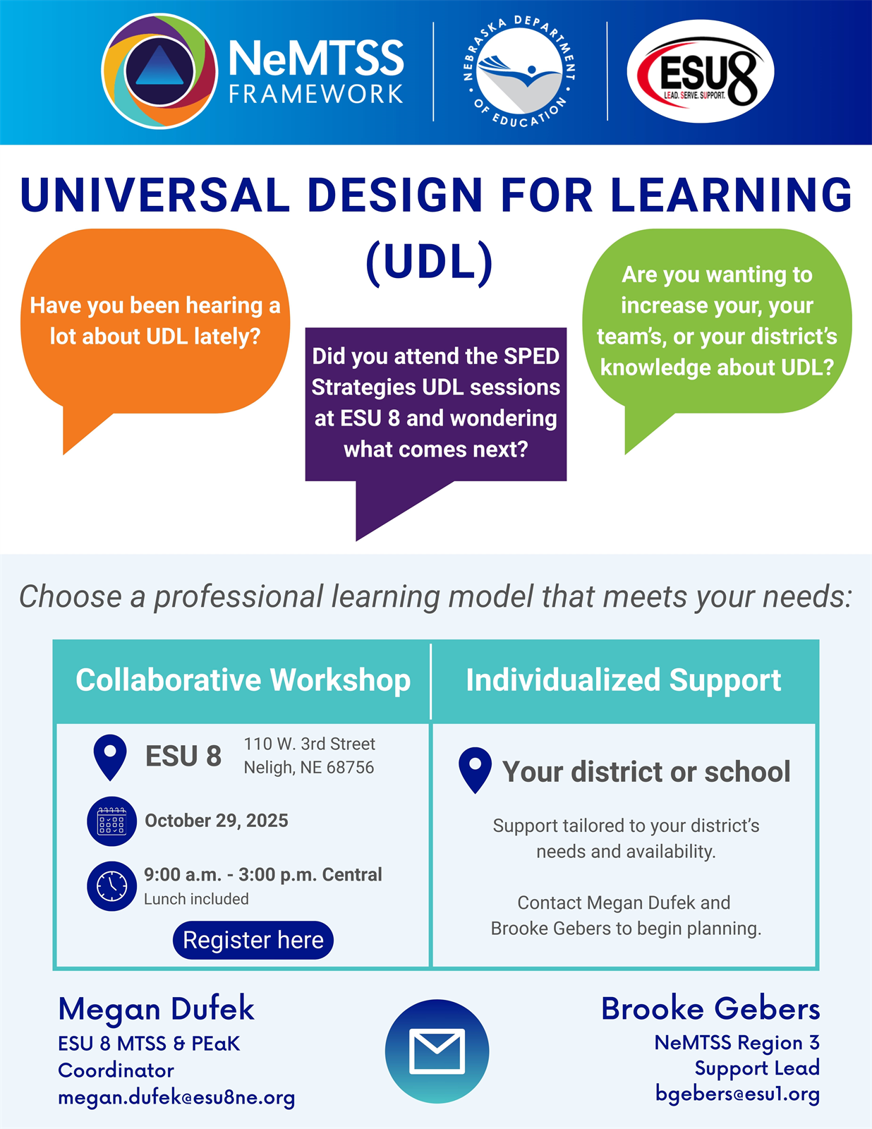 Join us for an interactive and collaborative workshop focused on Universal Design for Learning (UDL) within the NeMTSS Framework. This session will guide participants through a review of key Tier 1 Core features, emphasizing strategies for building equitable, inclusive learning environments that support the success of all learners. Through discussion, reflection, and hands-on activities, educators will explore how UDL principles can strengthen Tier 1 instruction and promote access and engagement for every student.