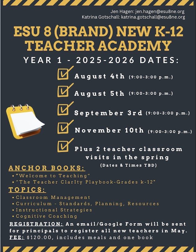 | Description | | New Teacher Academy is for participating 1st year teachers in ESU 8. |