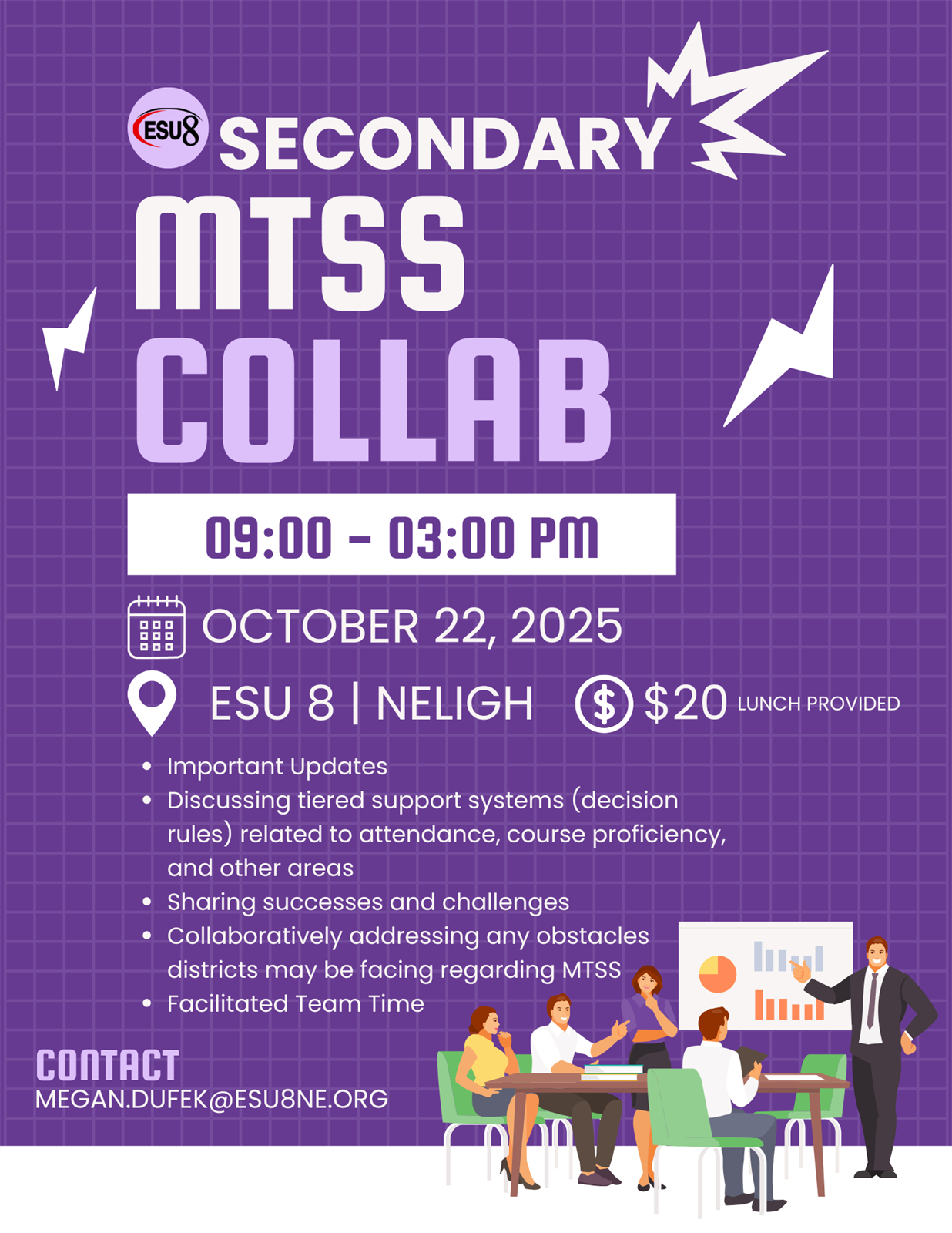 | Description | | In an effort to continue advancing MTSS initiatives at the secondary level, ESU 8 will be hosting secondary MTSS gatherings to promote collaboration among school teams on their MTSS processes. Schools are encouraged to bring whole teams and/or at least two members. This session will focus on: