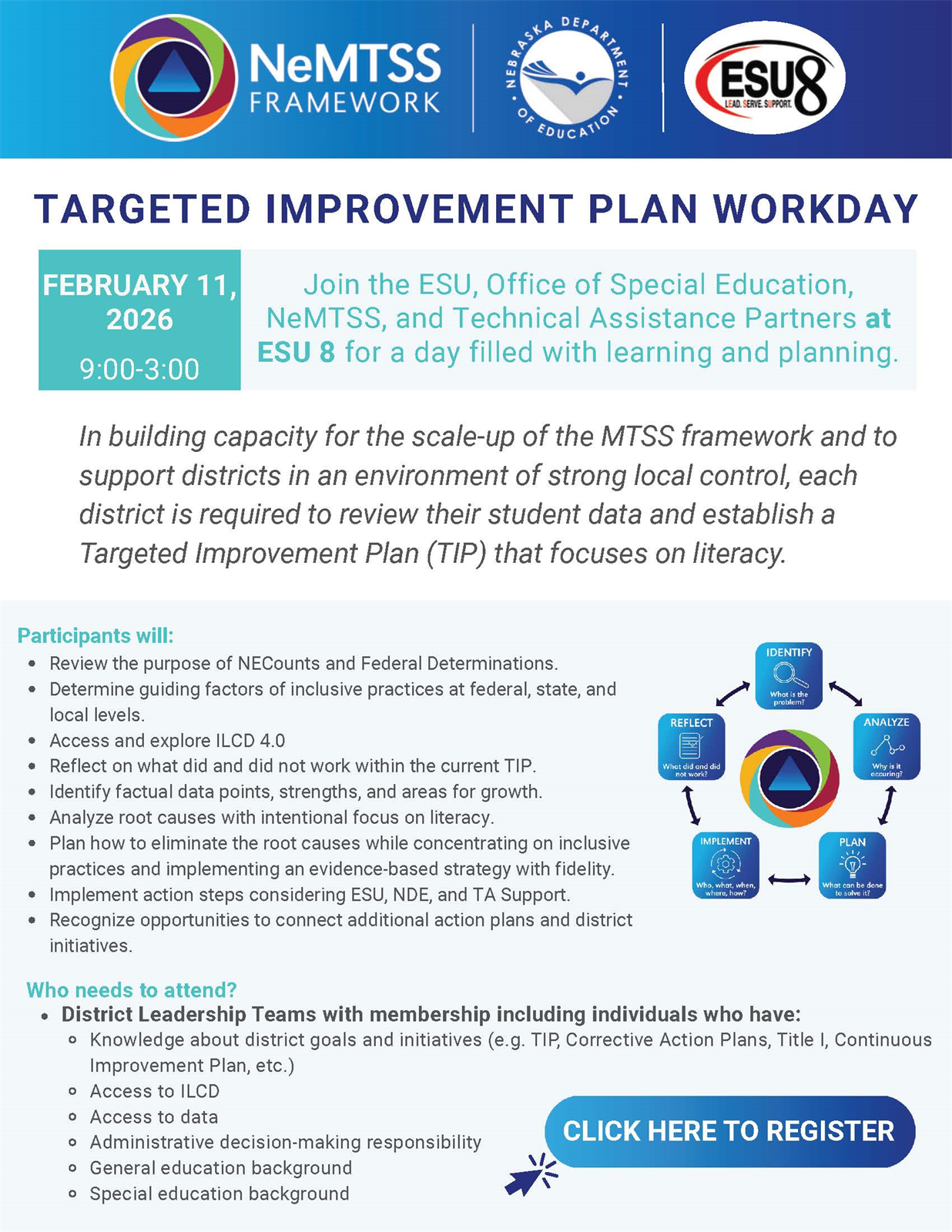 ESU 8 is hosting the Nebraska Department of Education's Office of Special Education for a facilitated work session on your District's Targeted Improvement Plan. This offers an opportunity to seek clarification and initiate planning for the 2025-2026 TIP submission.