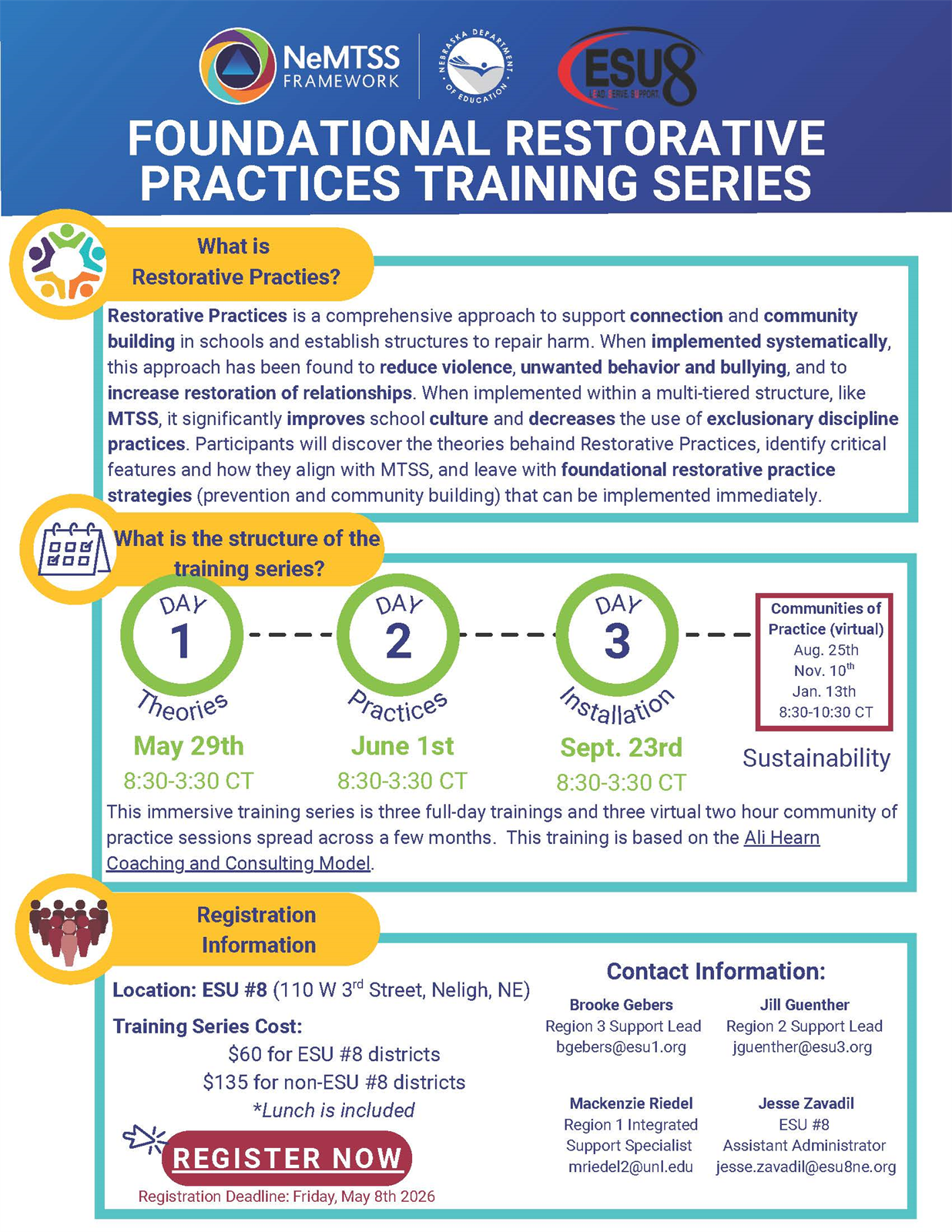 | | 0 | Restorative Practices (RP) Training | 5/29/2026 8:30:00 AM | | ESU 8 - Administration | Zavadil | System.Collections.Generic.List`1[odie.workshops.Facilitator] | | 0.00 |  | odie.workshops.Section |