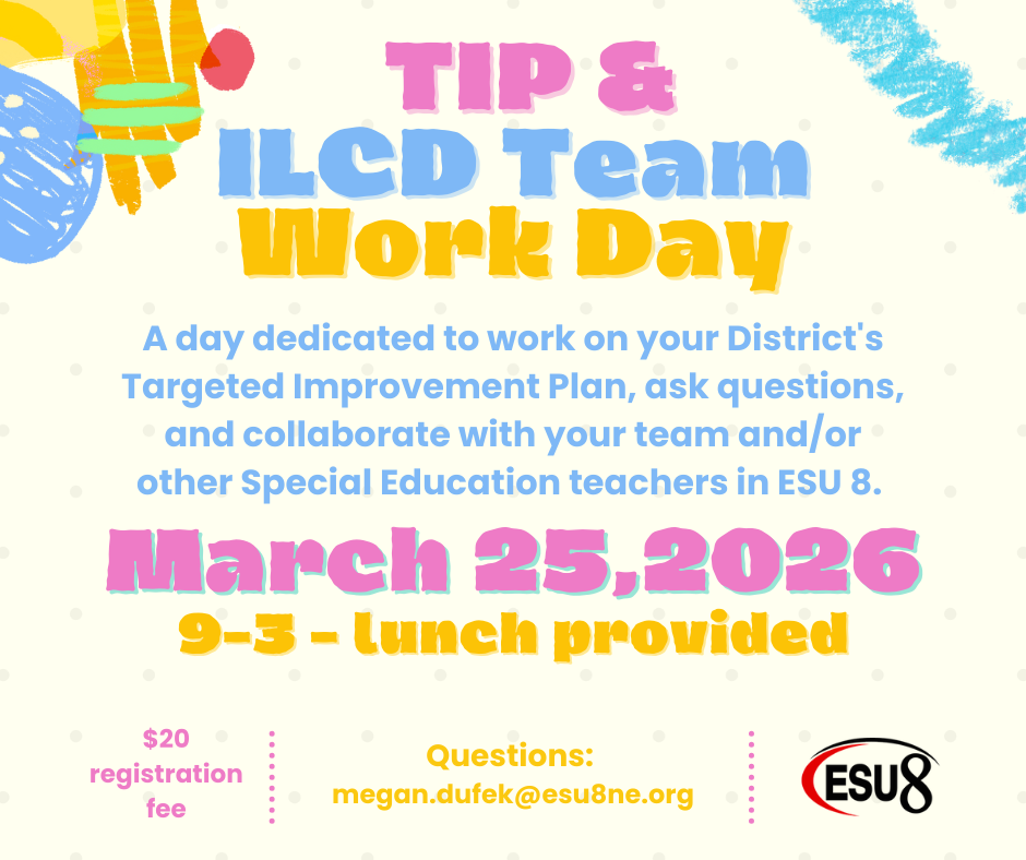 A day dedicated to work on your District's Targeted Improvement Plan, ask questions, and collaborate with your team and/or other Special Education teachers in ESU 8.