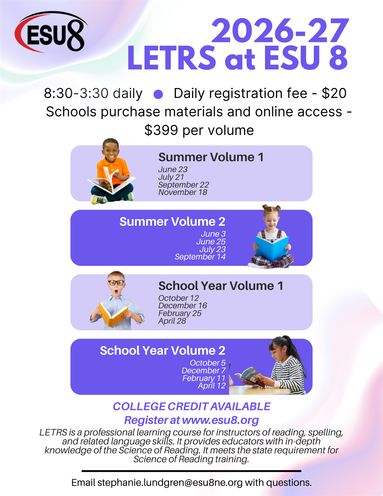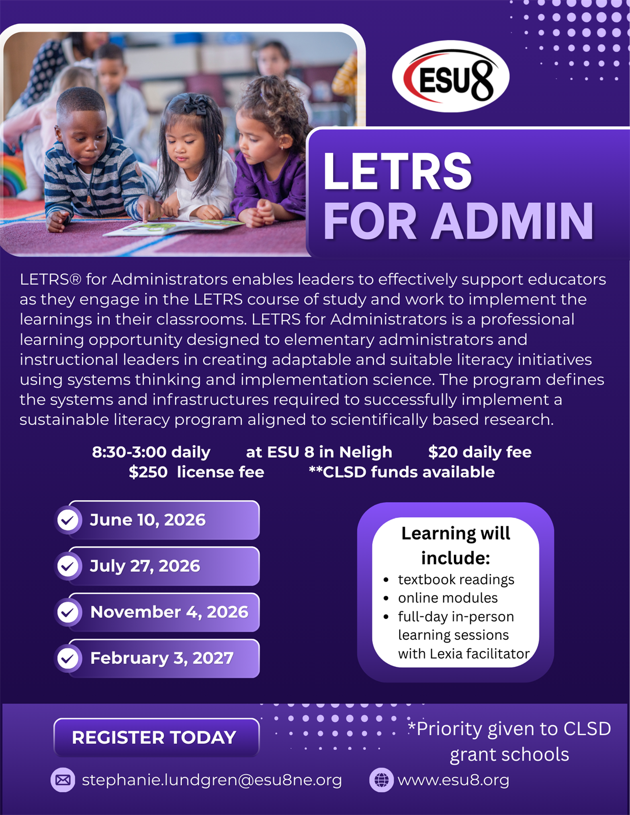 The most important factor in student success is the teacher. LETRS® (Language Essentials for Teachers of Reading and Spelling) for K–5 educators is an investment in their literacy knowledge and professional practice. Teachers gain essential skills to master the fundamentals of literacy instruction to apply and transform student learning. Teachers must have completed Vol. 1 in order to enroll in Vol. 2. Materials purchased by the school are $399. Lunch is $20 daily. College credit options are available.
