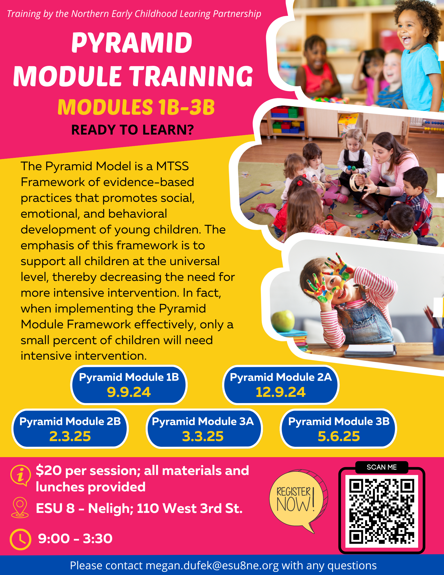 | Description | | The Pyramid Model is a MTSS Framework of evidence-based practices that promotes social, emotional, and behavioral development of young children. The emphasis of this framework is to support all children at the universal level, thereby decreasing the need for more intensive intervention. In fact, when implementing the Pyramid Module Framework effectively, only a small percent of children will need intensive intervention.